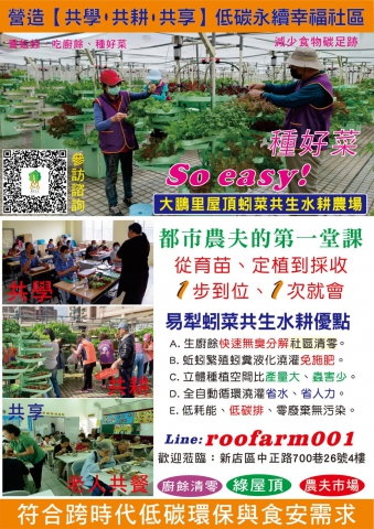 動機: 本計畫利用社區屋頂閒置空間,建置屋頂「蚓菜共生」水耕農場,並透過相關課程引導居民參與,並透過本計畫之中心理念「共學、共耕、共享」達到「化廢為食、減少食物碳足跡」之目標,藉此營造低碳永續幸福社區。 背景說明: 『化廢為食、減少食物碳足跡』蚓菜共生符合跨世代的低碳環保水耕農技。 將生廚餘回收投入『蚓菜共生水耕裝置』的『廚餘生態分解槽』經活水滴流水解軟爛後餵食與繁殖蚯蚓,並同步將蚓糞液化經自動循環澆灌『立式水耕裝置』生產蔬菜。