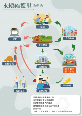 福德里為農田與現代住宅大樓的集合,許多在城市裡生長的孩子,不了解食物的來源,對於食材的認識是片面的。福德里內的農田可以透過規劃里民農園,讓里民親手栽培作物;也可以透過舉辦「農村體驗營」作為一個食農教育的場域;還可以透過與「巨獸綠色科技有限公司」合作,讓黑水虻這種可以去化城市的廚餘的昆蟲被社區認識,而黑水虻成長過程除了排便作為田園肥料,自身還可以成為禽畜飼料,如此一來可以讓里民農園生產成為一個封閉的循環,沒有資源會被丟棄,而是在一個循環內重複利用。