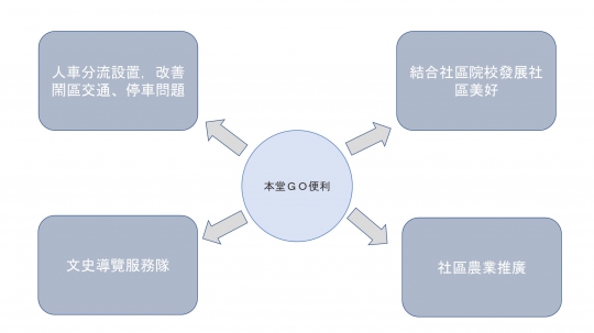 經本組實際踏查本堂社區後發現社區內雖有霧峰林家宮保第及林家花園與民主紀念館的文史重要資產和特色農產品,但卻存在著停車位不足、交通紊亂的問題。店家反映到了用餐時段來客的車子無法停靠,希望有更多的停車空間。因此本組想採人車分流的方式來捲動社區,振興經濟、流傳文史。 本組擬設計社區訂餐App,並開設餐飲區的步行者天國,讓客人線上下單點餐,由社區有償志工及弱勢家庭婦女等自店家送餐至社區外停車場,同時與鄰近菇農合作食農教育等活動,創造另類的霧峰腦滿腸肥之旅。