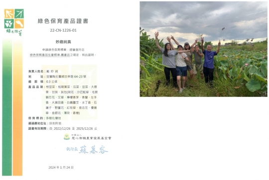 自覺大自然越來越重要,於是跟家人商討將土地拿來做成教育場地,目前已取得綠色保育標章慈心多樣化棲地認證。深信:農業是改變氣候的處方。長期投入生態解說教育荒野夥伴也是的環境教育師的妙純,自覺應該要下到田裡做點什麼。於是改變原本慣行的娘家土地,歷經休耕、養地後投入生產,這是妙純投入農業、人與自然共處的初心!加上老子哲學「人法地、地法天、天法道、道法自然」與從小生長的壯圍是個常會淹水「厚水」的地方,實踐老子順應天地、取法自然的精神,以適地適種的理念先種荷花在祖輩所遺留下的這塊土地漸漸達到永續循環。