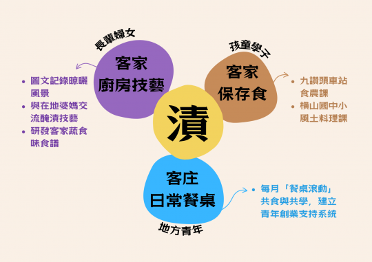 土者土者女子工作室以「剛剛好灶下」為客家蔬食品牌,藉由拆解與重組客家醃漬發酵食品的元素和歷程,以滷鹹淡的蔬食餐桌形式,展現客家人的好客與情感維繫,讓「吃」更具意義和感受。 食物反映生命當下的況味,保存食妝點客庄餐桌,同餐共食表達好客的款待心意;然而在現代講求便利、效率、輕省的生活,人們無暇張羅、烹調與享用食物,都市化與緊湊的生活步調影響人際關係疏離。期盼藉由自己的一雙「料理手」,以客家醃漬為媒介,在家鄉透過多元的飲食實踐,延續傳統客庄生活互助的情感精神,讓不同世代的對話產生流動。