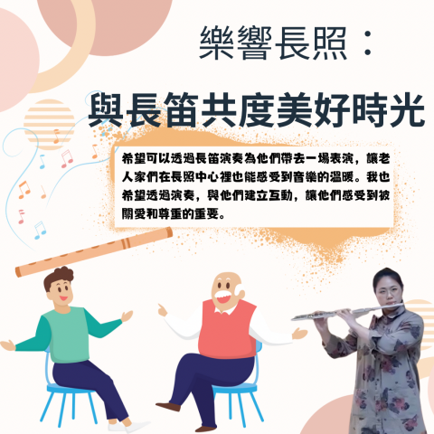 我從小開始學習長笛,雖然到了大學後練習的機會減少了,但最近一位朋友在長照中心工作,向我描述了長照中心裡的老人們很少有機會享受到演出的樂趣。由於疫情的關係,他們幾乎無法外出,這讓我想到可以利用我的長笛演奏為他們帶去一場表演,讓他們在長照中心裡也能感受到音樂的溫暖。我也希望透過演奏,與他們建立互動,讓他們感受到被關愛和尊重的重要。