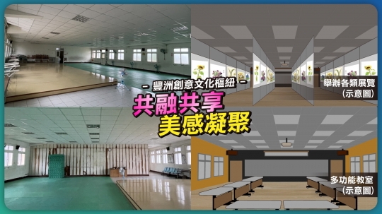 豐洲社區活動中心承載著早期郷民集資建蓋的奉獻精神,現在把這份精神延續下去,將打造一個充滿溫度美感與創意的聚集地。首先計劃美化建築物外牆及一樓牆面和公佈欄,使具視覺吸引力。接著將二樓閒置空間轉變為一個多元共享的場域,可展示社區的珍貴文物和居民的創作輪展,同時提供創新多變的活動空間。