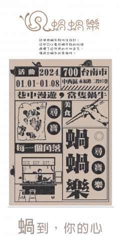 文學作家葉石濤的文章,葉石濤老師的故居就在蝸牛巷裡,也讓這些巷弄充滿了文藝氣息,蝸牛巷裡有好設置了好幾處可以拍照的裝置藝術,巷弄不大卻很好拍轉個彎迎來的是彩繪牆,看起來像是一個家,雖然有些斑駁了,卻又有著獨特的味道,這裡有吃的、喝的又可以出旗袍拍照,找個假日,當作獎勵自己平日的辛勞,把自己當成一隻蝸牛,跟著無數的蝸牛漫步於巷中吧。 透過尋寶活動讓人們更好的認識蝸牛巷 我們會先將一些特色建築 、食物、店家等等的蝸牛巷零碎的圖片印在手冊上 讓玩家去探險 路途中可以體會到那邊的