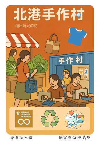 北港鎮早期北港三大人口成衣產業興盛為其中重要人口之一,然而隨著產業外移及消費習慣改變,當地傳統縫紉產業漸凋零,導致中高齡婦女失去原有經濟來源與重心。然而,快時尚興起所造成的大量衣物廢棄問題,逐漸凸顯。透過『手作村』的計畫,以北港新興市場媽媽們每天必經之地為孵化基地,加上我本身是市場土生土長的小孩,小時的記憶爸爸拿著留聲機麥克風,媽媽在市場裡幫客人量身訂製衣服,以前學校都有家政課,學習縫鈕扣及針縫的樂趣,轉化為青銀共伴的話題。 期待創作貨櫃組合屋空間為創作基地,推動「衣物再生」與「婦女再就業」。