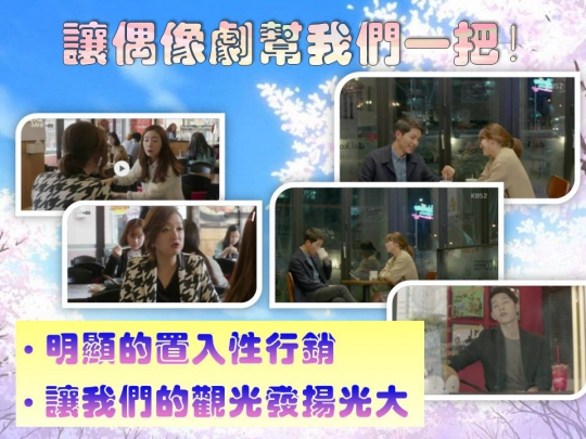 台灣人太老實,不懂得置入性行銷,韓國一部偶像劇一出,馬上促動很多商機!台灣人也可以學習這個精神,好好推廣在地文化!不要小看戲劇影響