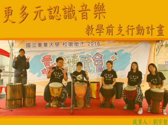 在國小擔任非洲鼓老師已經有3年的時間了,期間也陸續接觸過一些偏鄉學校的老師,發現在資源相對缺乏的學校裡的音樂課程,因為缺乏設備,在教學的實務上大多是以影片與音樂播放的方式進行。但這樣的方式除了聆賞與分析,難以讓學生體會到音樂裡的互動、會跟、能讓、以及情緒、張力等特性。是以提出「更多元認識音樂-音樂課前進支援行動計畫」希望與同樣可以進行操作且機動力強的藝術推廣師合作,進到學校的音樂課程,為第一線老師提供孩子認識音樂的動機、建立多元欣賞角度(操作、文化等),在這樣的點綴後,用不同的美學觀點認識世界。