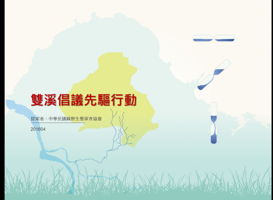 雙溪源自陽明山國家公園,流經內外雙溪與士林街區;串連自然荒野與都會,為北市難得之環境體驗藍帶。為引動沿線社區團體組織,跨域合作推動雙溪溪流生態廊道之保育復育;期透過系列行動串連沿線社區團體組織,重新學習認識雙溪上中下游環境故事,互相認識連結,並嘗試共識建立雙溪未來永續經營願景。以為滾動推動雙溪溪流生態廊道保育與跨域經營管理之開始。