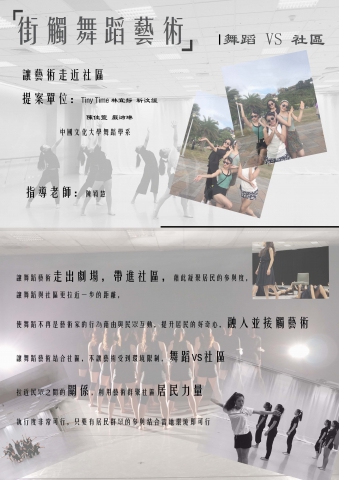 讓舞蹈藝術走出劇場,帶進社區,藉此凝聚居民的參與度,讓舞蹈與社區更拉近一步的距離,使舞蹈不再是藝術家的行為