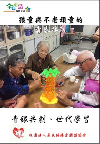 社團法人屏東縣臻愛關懷協會於105年度起,於屏東各關懷據點帶領長輩活動,我們發現,屏東地區有許多長輩因隔代教養,會帶孫子共同到關懷據點參加活動。 協會將在鹽埔鄉仕絨國小設立玩具圖書館,我們希望仕絨國小學生共同協力成為志工老師,到社區關懷據點分享玩具創作經驗。同時也能利用玩具圖書館回收玩具資源在社區關懷據點成立「學習角」,提供孩童安全的遊戲空間。 透過計畫將代間學習的理念與社區照顧關懷據點結合,讓孩童的熱情帶動長輩的活力,將世代的共學、分享、文化交流傳承,連結在地社區學校…等,推動社區代間共學。