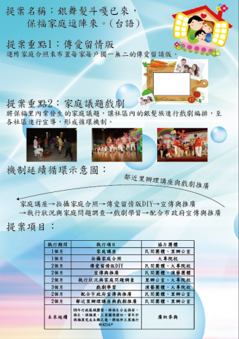 提案名稱銀舞髮斗嘎已來,保福家庭逗陣來。(台語)