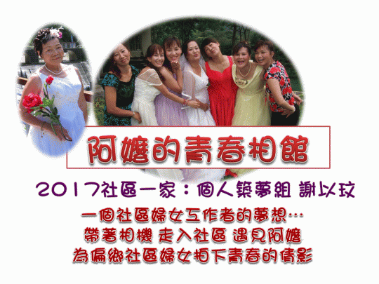 因為社區婦女教育的關係 許多年長婦女沒有機會拍婚紗 因此在社區關懷據點活動中設計婚紗照活動 藉由婚紗攝影中留下青春倩影 給這些在鄉村中努力認真的女人 一次當公主的機會 阿嬤活著記得自己幸福的樣子 PS.許多社區的老人婚紗照要金婚或30周年,喪偶失婚的婦女沒有機會拍婚紗