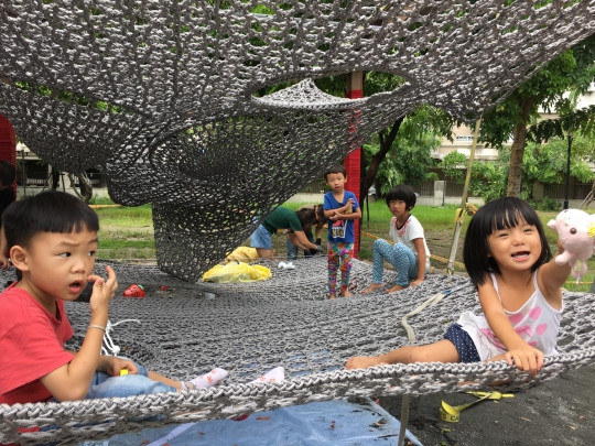 爭取孩子遊戲空間,台灣各地自發性發起翻轉罐頭設施活動,台南北區北元公園原先僅是鄰里小公園,沒有太多的預算,也沒有什麼豪華遊具,希望營造台南一個民眾參與、親子協力合作的攀爬網,最有溫度的編織網!