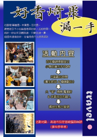 茄萣區為高雄海線最北行政區與台南市二仁溪交界,自古以盛產烏魚子聞名,境內興達港更是當地重要觀光景點之一,就地理位置劃分,茄萣還分有四大聚落,其中崎漏社區為最早發跡之地,蘊含漁村特色之外,更有傳承百年中藥房、傳奇的普洱茶專家、品質嚴選的豆花職人,古味風華的紅磚老厝對映洋樓建築,每一處都透著歷史足跡與文化傳承,更與國際保育類黑面琵鷺渡冬之茄萣濕地兩相對望。唯可惜是雖和興達漁港比鄰卻少有人知曉,也因社區人口老化沒落缺乏新生動力,故期望挹注本計畫推廣「地方再生」,透過體驗教育遊程,創造社區價值與凝聚力。