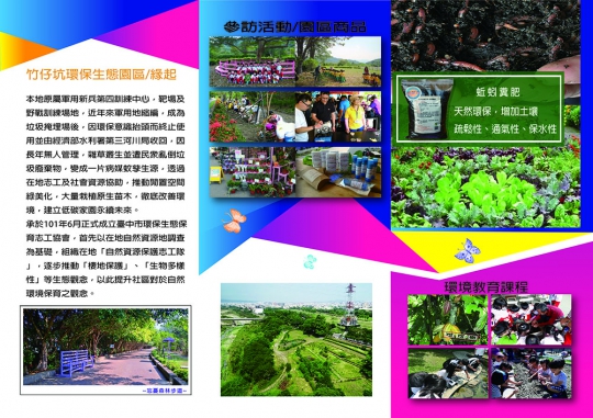 本基地位於台中市大里區健民里內,與塗城里交界端之草湖溪右岸高灘地。目前附近尚有農民少許耕種之外,外圍早期軍用新兵第四訓練中心,因軍用地縮編,由經濟部水利署第三河川局收回;經河道整治後,閒置空間長年無人管理雜草叢生,民眾亂倒垃圾廢棄物,病媒蚊孳生源。經竹仔坑河川巡守隊、太平河川巡守隊等單位成員們,於101年6月24日正式籌組「臺中市環保生態保育志工協會」(以下簡稱本協會),向第三河川局提出託管認養申請,建構「竹仔坑環保生態園區」(以下簡稱園區),推動閒置空間綠美化,大量栽植原生苗木,徹底改善環境。