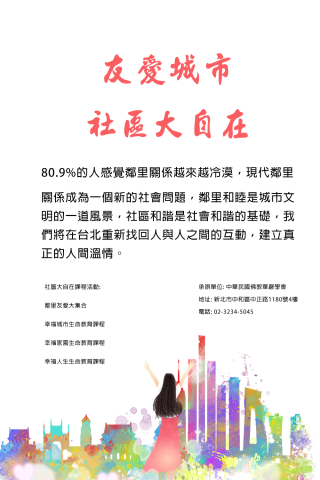 目前的城市居民中,80.9%的人感覺鄰里關係越來越冷漠,現代鄰里關係成為一個新的社會問題,為何住在一起三四年,鄰里之間的關係卻很疏遠?明明都是「抬頭不見低頭」,卻偏偏成了「最熟悉的陌生人」?社會節奏加快 互助需求減弱,對此在人口密集的台北,我們將重新凝聚鄰里間的互動,並使大眾充分認知這樣的一個改變對於個人生命有何價值,以生命教育課程及鄰里大集合活動,重新讓民眾找回人與人之間最初的友愛和感動。
