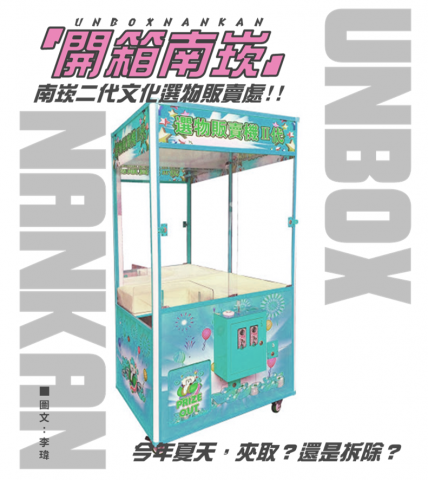 隨著南崁近年來的高速繁榮化,許多原屬於這裡的在地文化如老店、舊產業等也加速流失,這些空間漸漸變成夾娃娃機店及手搖飲品店。本次開箱南崁團隊將針對這些來不及向年輕一代說故事的「前輩」們策劃一場文史展。本計畫「南崁二代文化選物販賣處」將會調查南崁街的產業變遷,並將成果以有趣且有諷刺意味的方式展出。我們將以夾娃娃機為載體,並在內部佈置成老店們曾經的樣子、作為景品的「娃娃」們即是能夠在這些老店購得的老貨。透過與拆除老屋的機具相似的夾子,讓民眾省思在得到經濟利益的過程可能會導致部分回憶的消逝。