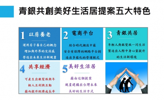 地方政府,採用國外經驗開辦「青銀共居」。卻忽略急於獨立的年輕人,沒有意願與銀髮長者共居,當「免錢照護員」。房東、房客雙方興趣缺缺意願不高,導致「曲高和寡」,致「青銀共居」執行迄今窒礙難行。 我們推動「青銀共居、共享住房」的創新概念,解決目前問題,我們主張:青銀共居是室友關係,不是照顧者與被照顧者關係。我們決定努力把銀髮族與青年結合起來共創社會新風氣,繪出一道美麗的彩虹讓我們的居住環境能青銀共融,治癒社會心靈與情緒。 感謝!信義房屋讓我們注重我們心中對於青銀共融的隱憂,以及能夠提出一些解決的方案。
