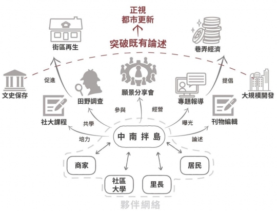「南港中南街區」發展時間較早、產權複雜,低矮窄小的樓房與巷弄與周邊的環境形成強烈對比、成為計畫的缺口。在當代的南港這個異質且多元的城市空間中,中南街獨特的價值是什麼?如何彰顯這樣的價值?為此,個人該有何行動?政府應如何施策?公民、社群團體之間又要如何延續與串連能量?三年前團隊進入社區,透過協作式夥伴網絡、社區營造,在主流都更論述中找到文史保存的縫隙。2021年,讓街區的大家無可避免的參與其中,持續串連既有資源、擴大關係網絡,從小眾到大眾、化被動為主動,共同形構對於街區未來的想像與認同。