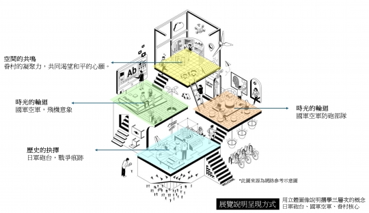 信義房屋全民社造計畫,提供社區營造實踐平台,包含獎勵金、工作坊和師資輔導等珍貴資源。藝術與人文教育研究所致力將藝術教育轉化為創意體驗,以傳達社會文化議題、價值和意義。團隊以此目標組隊報名,期望在社區打造具有文化影響力的創作。空軍三重一村為新北市眷村類文化資產之首例,保存了日治時期的防砲陣地和地下甬道遺跡。團隊進行田野考察,重新梳理近80年的土地記憶,以趣味互動及藝術美感的方式呈現。結合鄰近的光興國小藝術教育課程,引導孩子學習用展覽說故事,融入創意設計,展現歷史價值、加強在地文化傳承,吸引人潮。