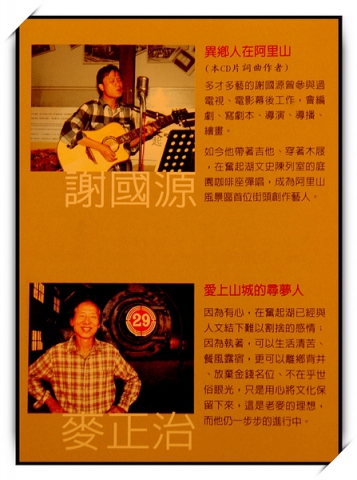 阿里山森林鐵道自1912年通車以來.歷經多次的天災與人禍.其人文之保存和增加國人之關心是必要的.因此製作阿里山小火車之dvd.為台灣本土文化盡一心 阿里山歌詞如下.也是拍攝dvd之內容.當然為活化dvd.我們將以說人文唱歷史的方式來進行