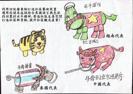 由社區志義工帶領社區居民辦理廢棄物改造童玩DIY成長營,培訓種子教官外野教導資源回收的重要性,並讓達成世代交流三代同堂同樂的目的,由簡而繁,進而一同動手運用廢棄物打造社區大型裝置藝術-水牛,除能尋回古早記憶外,也帶領新住民融入族群,融入異國創意打造社區友善空間,打造社區特色,帶領社區觀光產業提升,營造舒適家園環境。