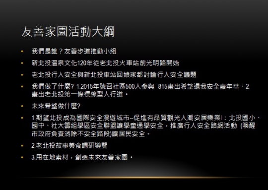 友善家園工作小組:近年來看到北投,許多地方已經很美,但是也許多街道不太友善,逼著行人穿梭在車流之中,所以我們將推廣1.行人專用步道網,讓每個人能更安全漫遊北投,2.有許多故事美食,需要調研北投故事美食,規劃導覽,欣賞北投之美,3.需要鼓勵年輕人,用在地素材推廣有特色的友善家園。