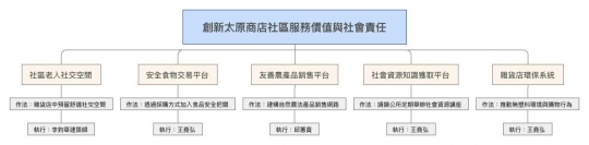 改造計畫起源: 現代在大賣場與連鎖便利商店時代下的傳統鄉村雜貨店越來越沒有存在價值,大賣場以量制價的紅海市場壓迫著讓鄉村小資本雜貨店越來越難生存,連鎖便利商店則提供所有資訊與物流的服務讓傳統雜貨店生存困難,在兩大勢力的普及化底下,傳統鄉村雜貨店難以生存,本計劃則提供傳統型態的鄉村雜貨店改革創新的一種模式。 改革作法重點如下:A提供社區老人社交的舒適空間,B提供安全食品與食物的交易服務平台,C提供鄉村社區小農友善販賣通路與平台,D提供免費知識獲取(環境,農業,政府長照制度)的友善空間