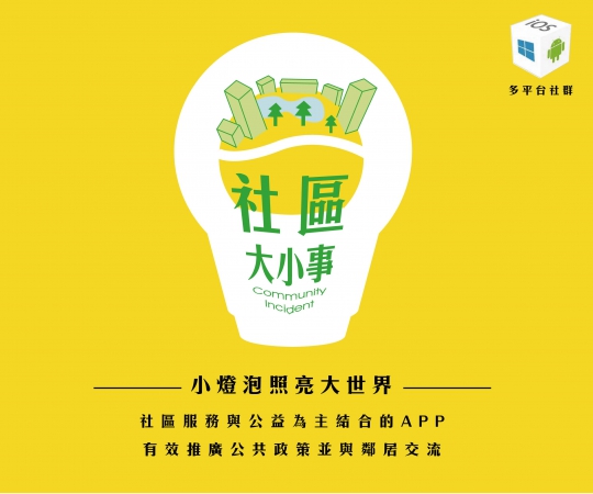 現在是個國際及網路化的世界,反而讓大家忽略了身邊的鄰居及大小事,對這世界了解反而忘了身邊的事物,我們重視你周遭的大小事,讓你活得更有溫度,讓共享、團結、互助的力量,從小地方團結起從而變成大力量。 建立個以社區(以里為單位)居家的人為主的app(家挺主婦 老人 小孩等)方便他們建立及分享資訊如團購訊息,開課、野餐、旅遊、二手物品買賣,或是店家推薦如 木工、水電、美食等,及育嬰、托兒等服務分享。 小事情我們也認真看待。