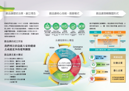 2023年,台灣的人口將邁向負成長,高齡化少子化已經迫在眉睫,自2015年開始,我從一個單純的善念出發,集結了一群仁人志士,透過多項跨領域整合的知識工程,以全民健康、關懷濟弱為願景,用有趣、愛與關懷作為設計主軸,將各種專業健康知識與健康行為,透過手機App作為載體,用遊戲模式設計出人跟人更多的互動而靠近,今年將實際落地試驗基隆市不老社區、桃園市高齡長者膳食委員會。社會責任與公益是我們的發展使命。