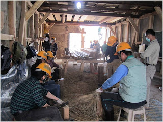 著辛苦的汗水,但臉上掛著是歡喜的笑容;從房子的木架結構、 上釘、剁碎稻稈…等
