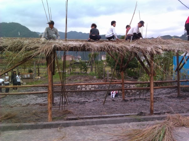 草(屋頂)、黃藤(繩索)、菅蓁(牆壁)等植物,以交換工的方式,來製作傳統的