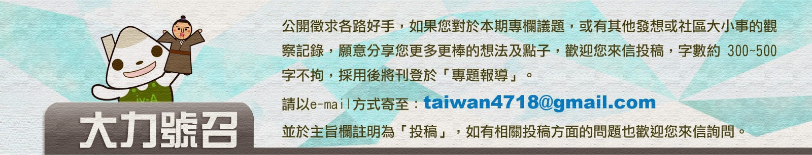 活動訊息:http://www.taiwan4718.tw/news_list2.php?class_item_id=10