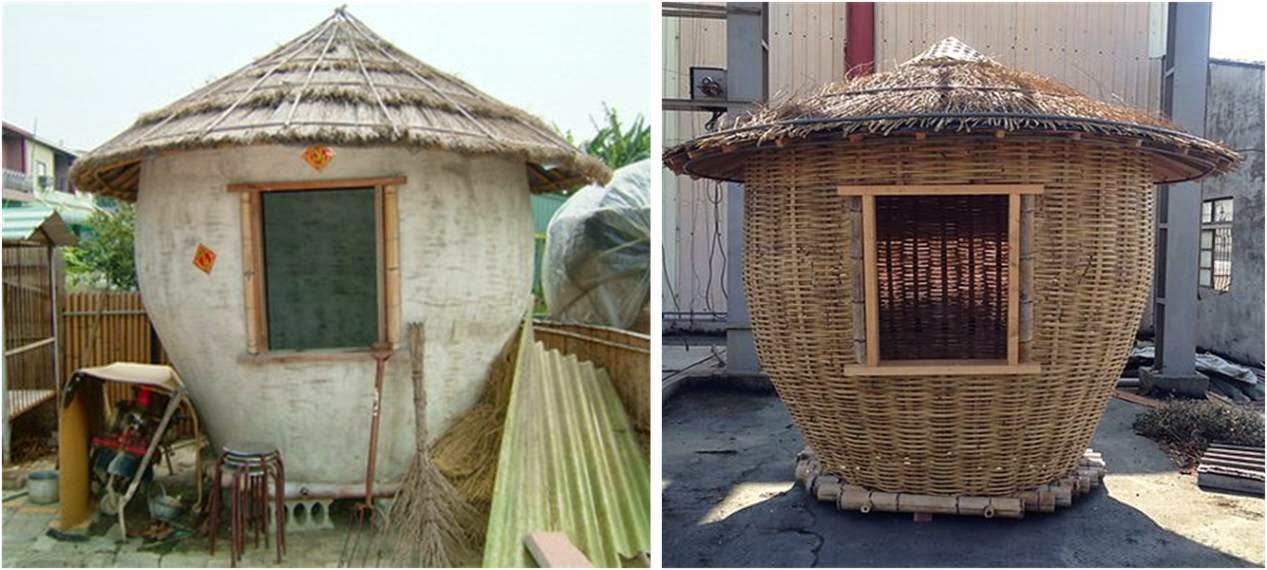 古亭畚的屋頂大多以茅草搭建而成,較考究的則以竹管作頂,圓形穀倉也是就地取材,以竹子做成骨架後,外殼以竹篾(竹片)編成,再塗上以稻殼或牛糞混合泥漿而成的塗料,最後外觀再塗抹石灰保固,所以古亭畚主體幾乎都是白色的。