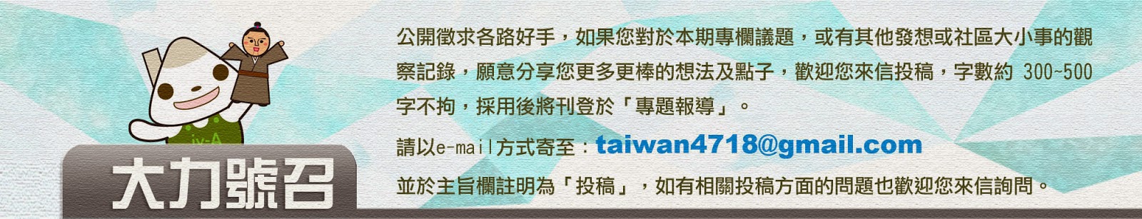 歡迎各地社區夥伴不吝來信至taiwan4718@gmail.com,可為您於社區一家官網進行社區活動宣傳,更多最新社區活動訊息~請詳見社區一家網站:http://www.taiwan4718.tw/index.php。