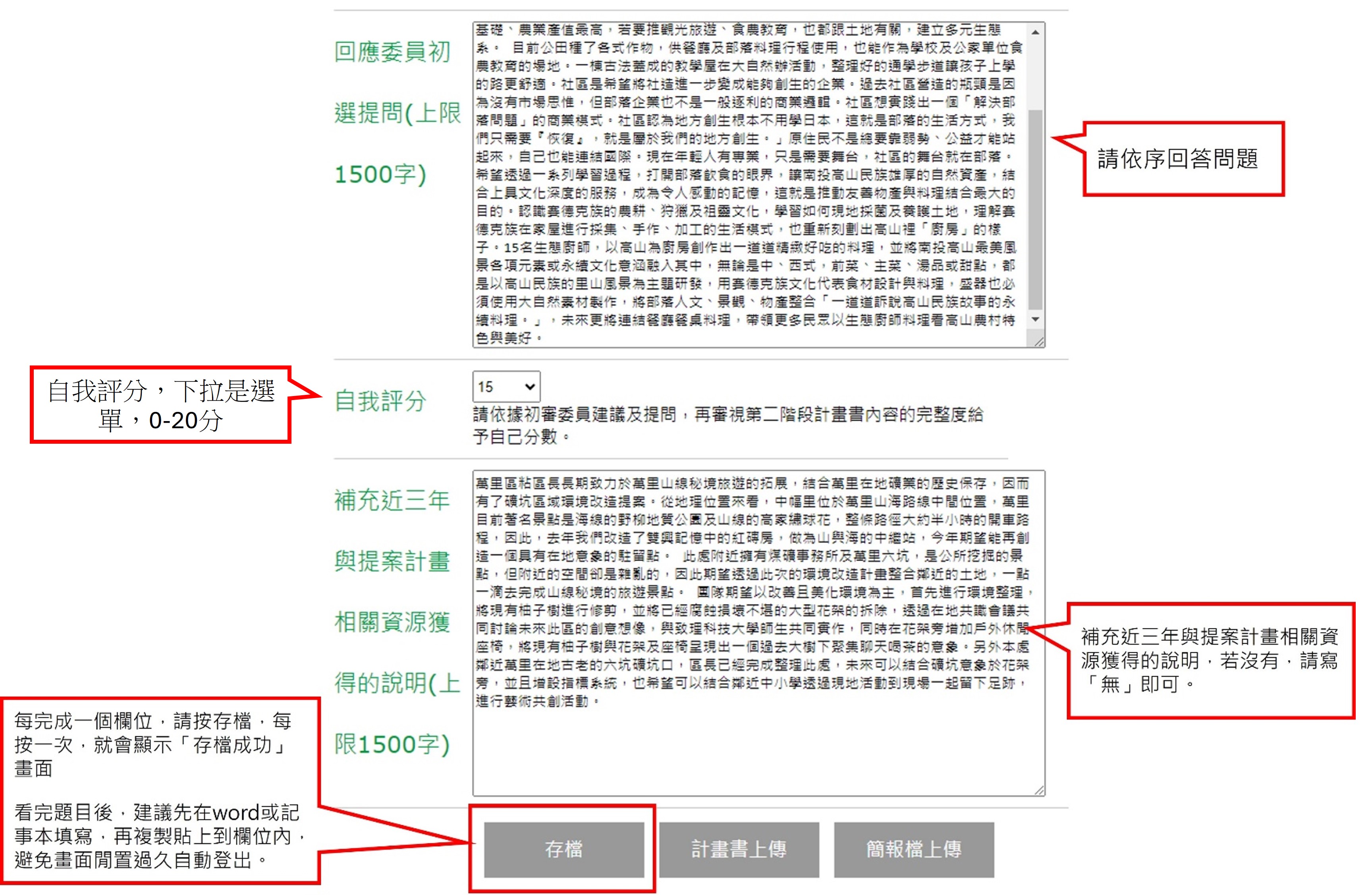 5.系統有字數計算功能,超過字數會跳出提醒視窗;要確認資料是否登錄成功,可重新登入一次,如果回覆欄位資料都在,表示存檔OK。