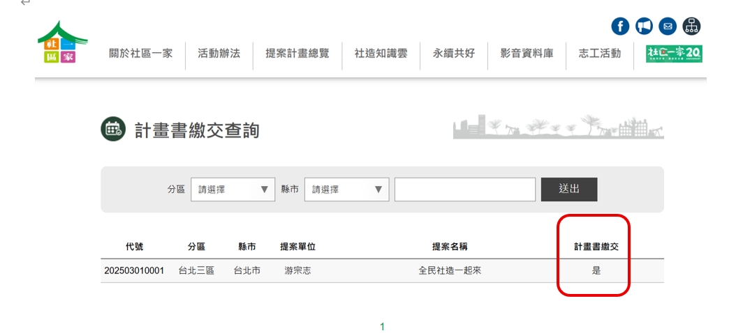 計畫編號查詢:社區一家官網→提案計畫總覽→報名資料或初選查詢→最左邊的「代號」