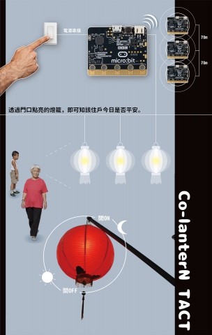 燈籠象徵著光明與威儀,燈籠上方書寫著國泰民安、風調雨順,不僅是最簡單的祈禱,也是對於最虔誠的表徵,它亦可以是居住安全理想中最簡單的一步。 藉由Micro-bit迷你晶片結合地區廟宇的燈籠,將開關燈籠塑造成日常生活的一個環節,每日的開關,能將訊號傳遞至里辦公處、透過門口是否開啟燈籠,藉此判斷居住者安康與否,藉由點亮燈籠再現漁村文化,實踐地方安全網絡。 「點亮燈 籠絡聚落安心網絡(CO-lanterN TACT)」,命名概念源自於本次計畫核心理念,透過共同(co)點亮燈籠(lantern)這個舉