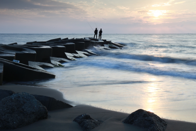 夕陽餘暉,海風迎面吹來,故鄉海岸一隅,佇立在浪花之間的釣客,閒話家常之時等待著魚群上鉤,波光粼粼的海面映照出生活裡的樂趣和期待,原來這就是故鄉的海阿!