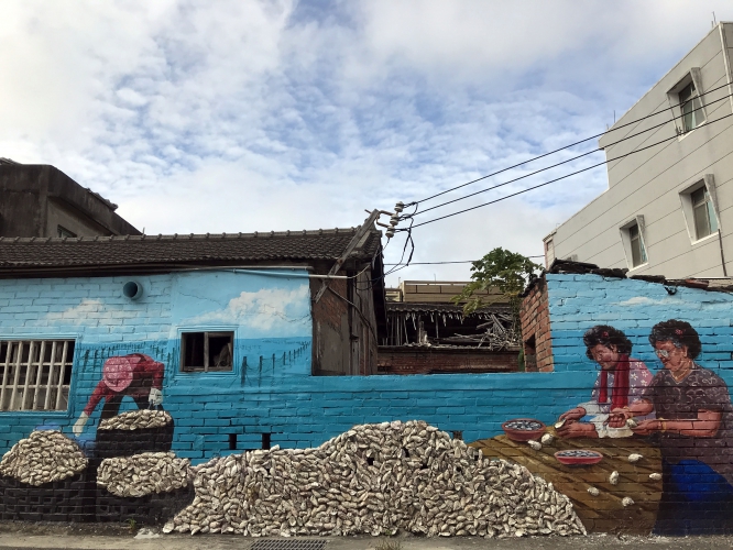 雲林縣口湖鄉港西社區,早年曾經是雲林縣的商港之一,是台灣與澎湖最短航距點,但隨著當地地層下陷,人口外移,社區漸呈現疲態面貌,當地運用在地養殖業的蚵殼為元素,將老舊的紅磚牆為畫布,將討海人的辛勤又質樸生活點滴完整呈現。