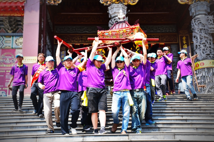 村里的廟去進香,大家同心協力把神轎抬下樓。