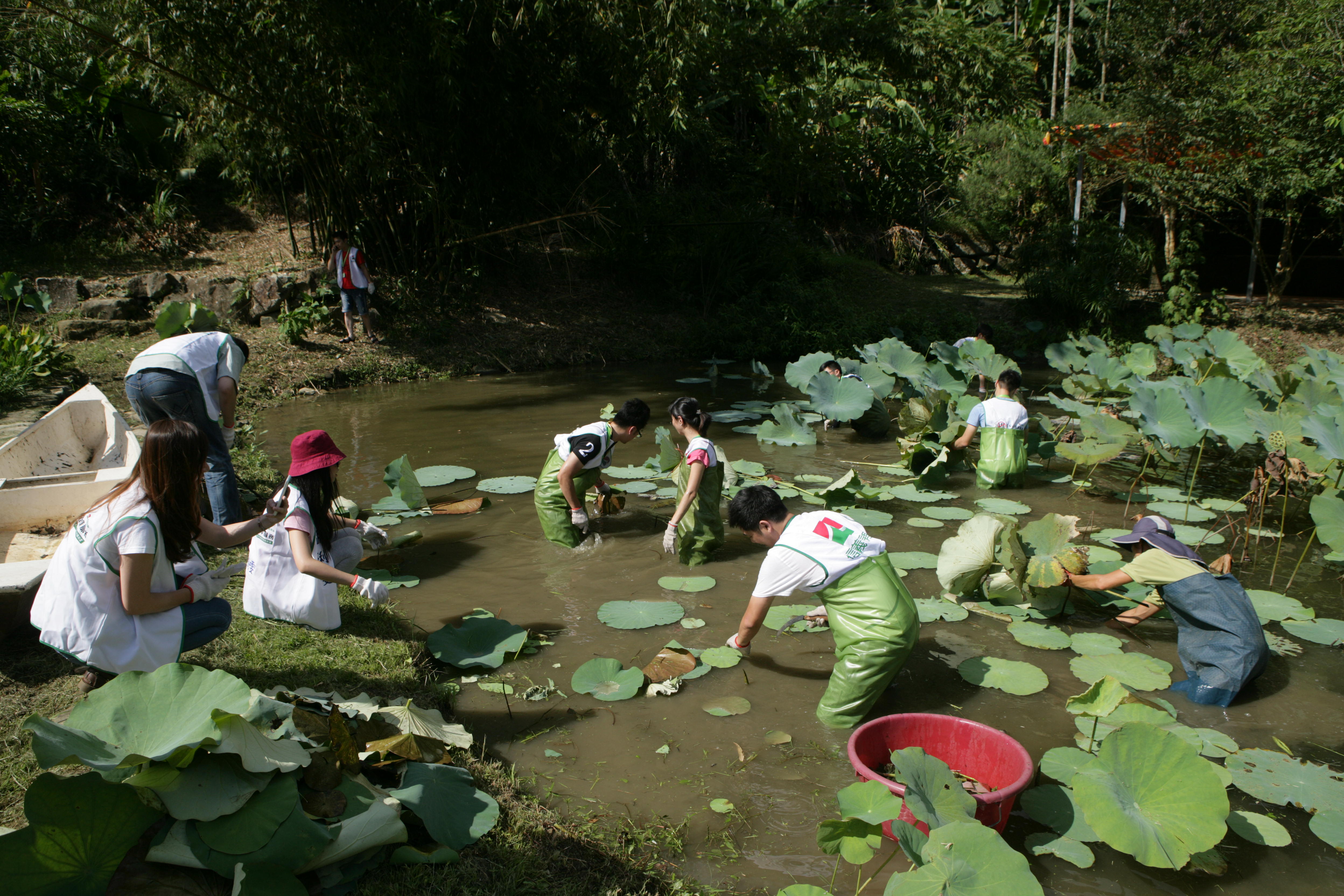 過去汙水處理多半使用化學藥劑,殘留的化學物質對人體、環境都存有潛在危機,設置生態池來淨化汙水可以兼顧去污及保育環境,缺點則是凡事都需人工來進行,有較為龐大的人力需求。曾獲信義房屋社區一家贊助的台灣濕地保護聯盟,一直以「工作假期」的模式,堅持「做中學」的精神,走訪各個大小不同的自然濕地與人工濕地,學習如何保育、復育台灣的水生植物,並進一步深入社區與學校,參與大大小小的濕地生態復育工作,目的是希望喚醒社區居民們對濕地生態的重視,並能結合社區力量共同復育與維護濕地環境與在地性的水生植物。這次台灣濕地保護聯盟率領信義房屋志工,來到「新北市坪林仁里坂13號、14號水質淨化示範區」協助生態池的維護。