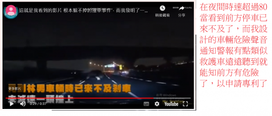 在當時的昨天看到一個如圖檔的車禍車件根本無法避免,因而想到了類似救護車或汽車防盜器的警報遠遠聽到就能防止車禍了,如你在高速公路停車會有後方追撞而這個裝置能在遠遠聽到就減速而防止這類事故發生,如火車平交道有安裝火車就能在遠遠的地方聽到前方有事件因而停車拯救事故 如上次火車撞到工程車造成40幾人死亡如果工程車有此配備,或者當時常按啦叭通知前有事故就不會有此事件發生了。而這樣的一次事故能少損失幾億元雖然現在台灣以有平交道應用措失而別國還沒有,能設在國外。