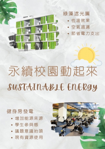 永續能源技術的提升可減緩不可再生能源對地球的影響,長期發展有望取代不可再生能源,但永續不僅需要開源更需節流。 據行政院,110學年台灣學校共1萬964所,學校平均一年電費為260萬元。學校用電主要分為照明和空調,若從校園落實能源轉型將大幅影響台灣整體。 因此,我們希望將校園健身房的飛輪變發電機,透過踩踏動能轉為電能。裝置中的變流和逆變器則會將直流電轉為交流電,供其他裝置電能。此外,也在教室安裝藻類遮光簾,以達到恆溫控管。除了遮光恆溫還能有效清淨環境空氣。將學校現有資源的運用最大化。