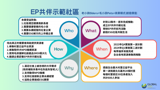 台灣2025將邁入超高齡社會,65歲以上老年人口會達到20%;政府政策與社福機構主要投入在照顧16.5%失能失智老人,而每天實際產生的高齡者需求還有高達83.5%,這些高齡的亞健康老年人口長期被忽略,缺乏的關心與陪伴,漸漸衍生許多社會問題、心理健康問題。而”陪伴是最好的良藥”,因此我們推出-全球首創EP共伴示範社區(Elders+Pets)。