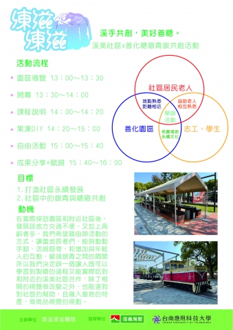 一、前言 台灣糖廠是日治時期重要的產業,而到了現今,也是台灣重要的遺址,現在雖然很多地區的糖廠已經停止營運,但人們將它改建成了文化園區,形成了新的一種觀光產業,卻依舊缺乏完善的宣傳規劃,沒有發揮到最好的效果、年老失修。 二、動機 由於上述情況,我們決定和當地的溪美社區合作,讓當地的居民,不管是年長者、留於此地的青年一同在糖廠參與活動,也藉由這個活動帶來更多的遊客前來此地觀光。