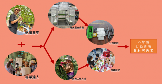 東勢,產出的水果幾乎聞名全臺,擁有許多專業農務技術與人才,東勢雖水果聞名各地,但在地方上的教育卻缺少此領域相關的學習課程,相較於客家文化學習,「農識」體驗較難在校園落實,其中原因包括學校老師缺乏農務實際操作經驗,且東勢果園多位於山區較難進行移地教學等;另一方面,越來越多從事農業的長者屆齡退休無法下農地工作,地方上應該引以為傲的「農」事,因此逐漸在地方流逝。故設計「不彎腰行動農場」教材教案進入校園與社區,減緩「農識/事」在地方上的流失-向下針對學子推廣食農理念、向上以長照觀點出發提升長者行動自信。