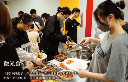 父親的思覺失調症與童年的創傷,促使我走入了兒少陪伴的世界,五年前與夥伴創立了微光盒子,走進安康社區與孩子相遇,期許自己能為孩子建立溫暖的避風港。過程中我們看見孩子因貧窮產生的飢餓問題,但給予物資的形式反而會使孩子產生福利依賴,直到玩心基地廚房的落成後,孩子拉著我們教他煎荷包蛋,看見孩子學會煎蛋時的笑容,讓我們有了創立微光食堂的想法,準備生鮮食材讓孩子來到據點後,學習準備晚餐,在溫飽的同時也能夠賦權孩子,此外,也會帶孩子走入市場與店家認識食材,學習不同的餐飲技能,進一步培力孩子的生活能力。