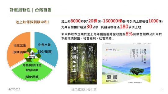 1. 綠色冀泉社企成立至今,推動智慧精緻林業,發展樹的循環經濟,媒合土地,種多樣台灣高經濟原生樹可滿足企業ESG、自然碳匯解方、生物多樣性價值;樹長大後取自然落枝葉製成商品與服務供應企業綠色採購,形成一個產業生態鏈,而每個環節都需在地就業人力。 2. 企業ESG及減碳透過種樹是好選項,種樹需要土地、樹種選擇、種植與養護、追蹤紀錄。 3. 台東耕種人口老化、少子化、人口外流,閒置與廢耕土地多。 4. 台東公部門急需培養在地深耕產業,除了政績與稅收,回饋金可用在社會福利與救助。 5. 台東池