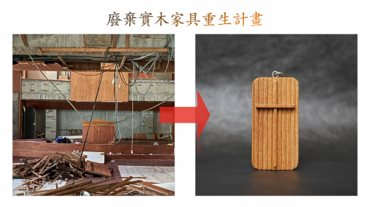 城市內充滿可重複利用的舊木材。例如學校更換課桌椅、家庭重新裝潢或是災害留下的木材等。其木材雖然表面有油漆、鐵釘或是不完整等,均可以藉由非類、整理與數位加工的方式進行小型木製商品的設計與製造。